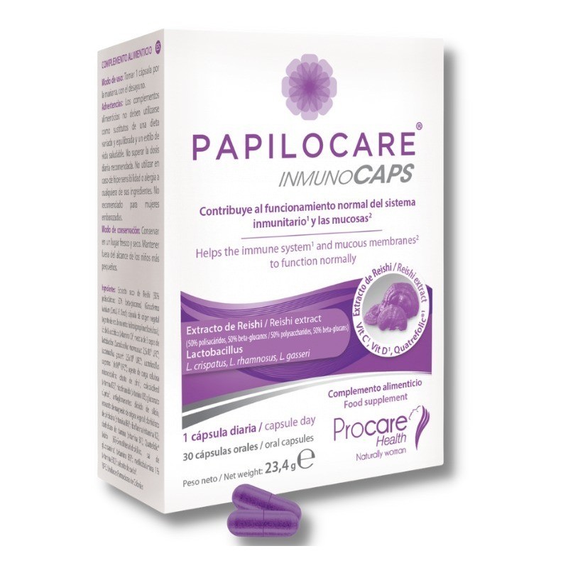 Papilocare® Inmunocaps es un complemento alimenticio a base de extracto de Reishi que contribuye al funcionamiento normal del sistema inmunitario y las mucosas.